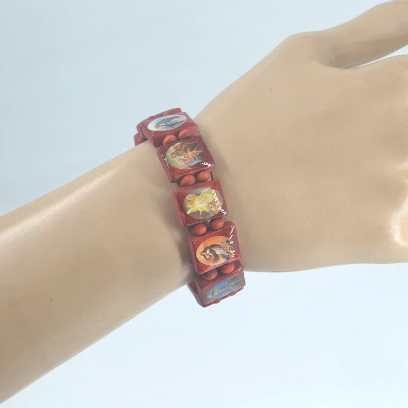 Natural wood beads with elastic cord and printed religious icon tiles.