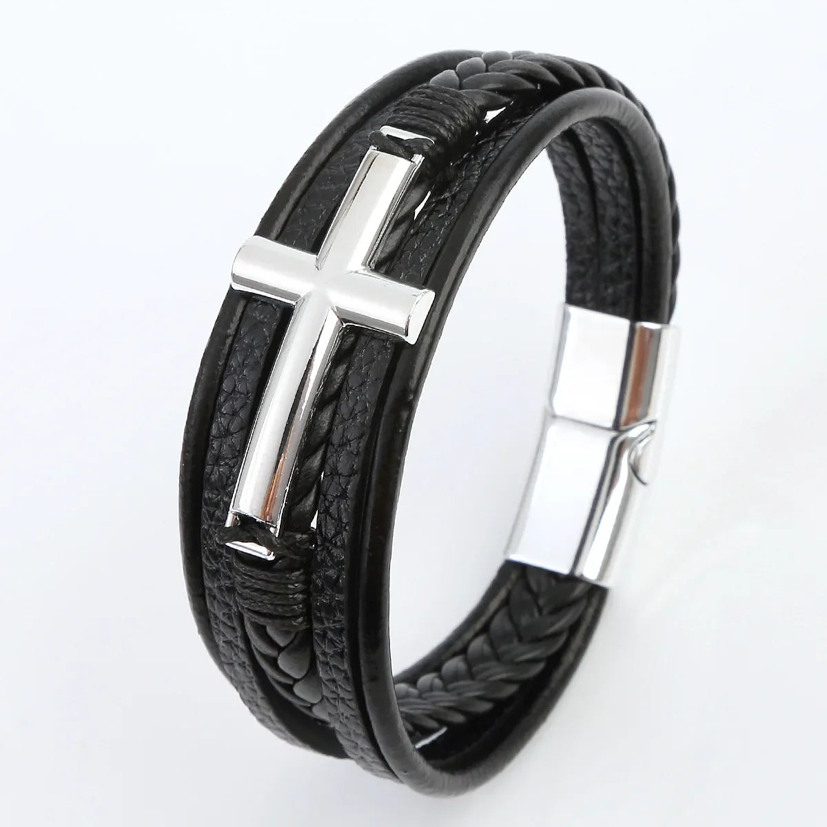 Multilayer braided leather design with a sleek black cross charm centerpiece