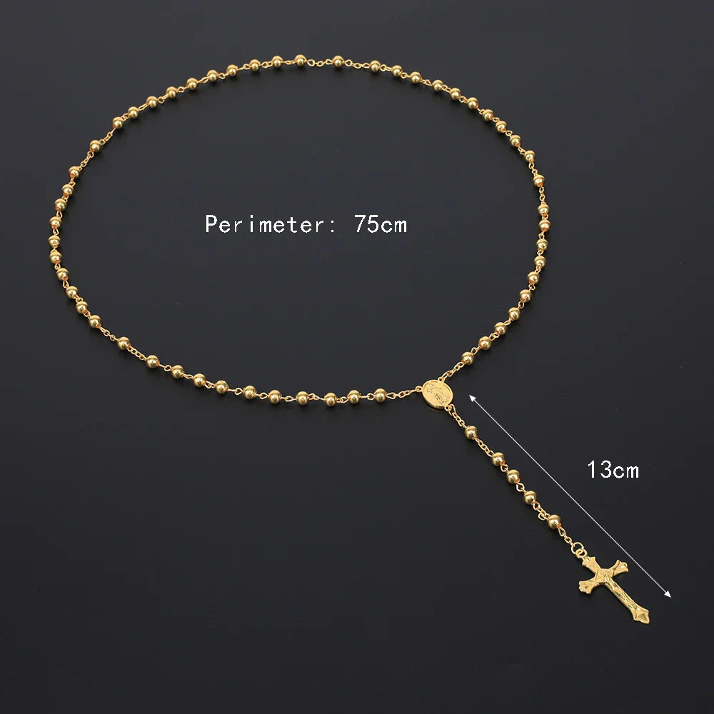 Gold Color Rosary Necklace – Long Crucifix Chain with 6MM Beads for Men & Women