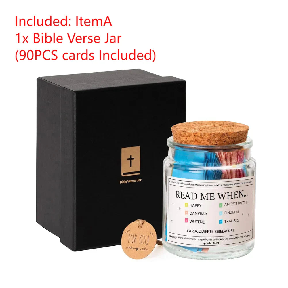 Durable glass or acrylic jar with high-quality printed paper scripture cards (materials may vary by seller).