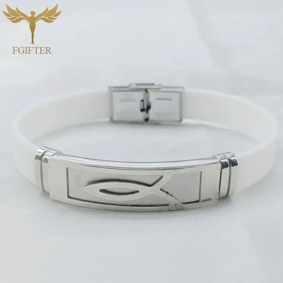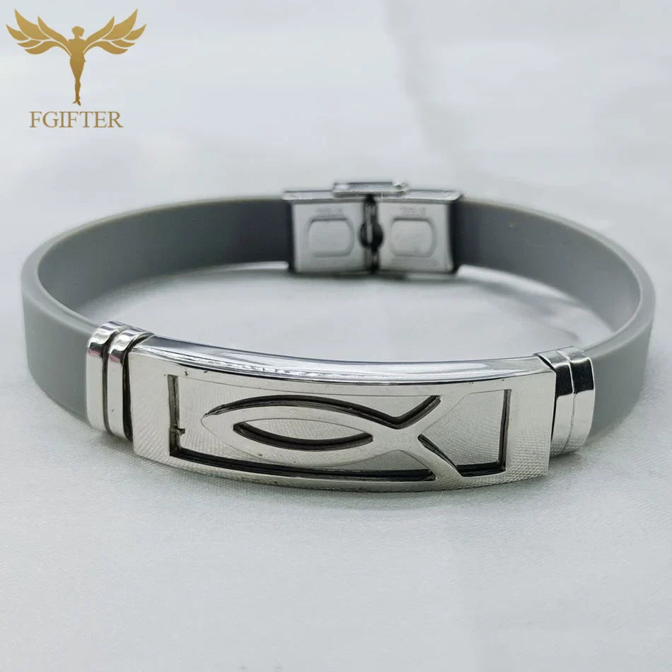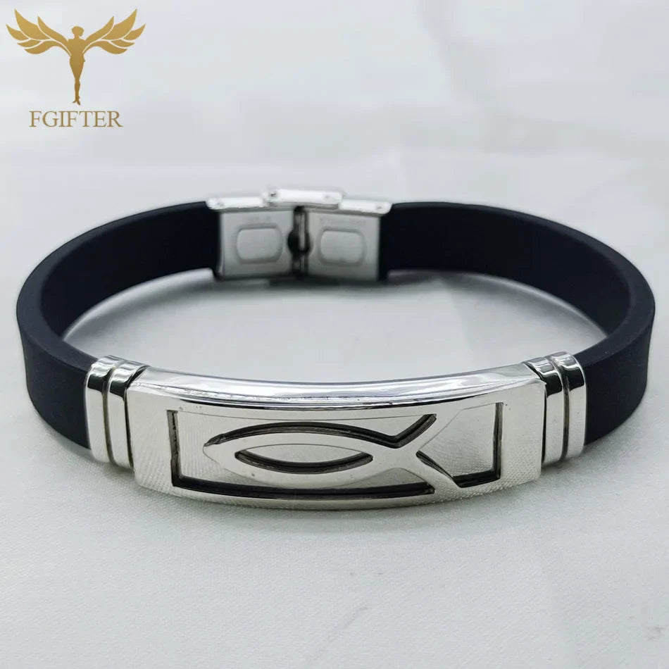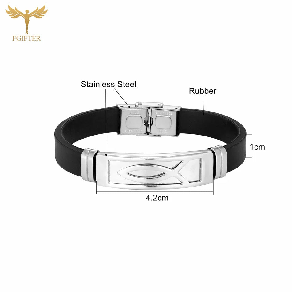 Durable stainless steel Ichthys (Jesus Fish) plate and high-quality silicone rubber strap with metal buckle.