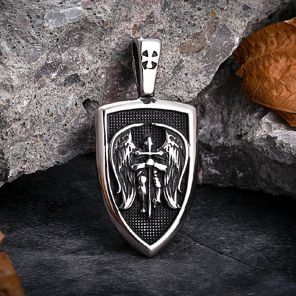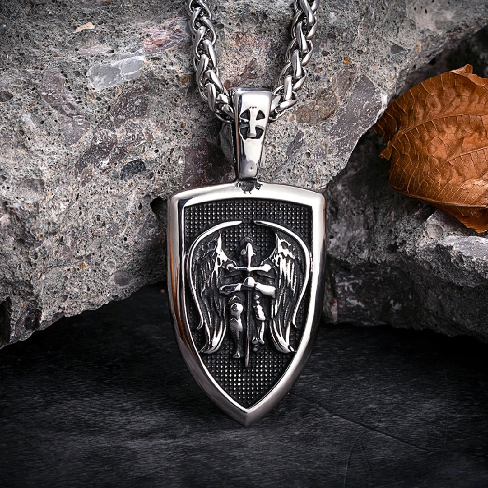 Viking Archangel Knight Necklace – Stainless Steel Shield & Angel Wings Pendant for Men
