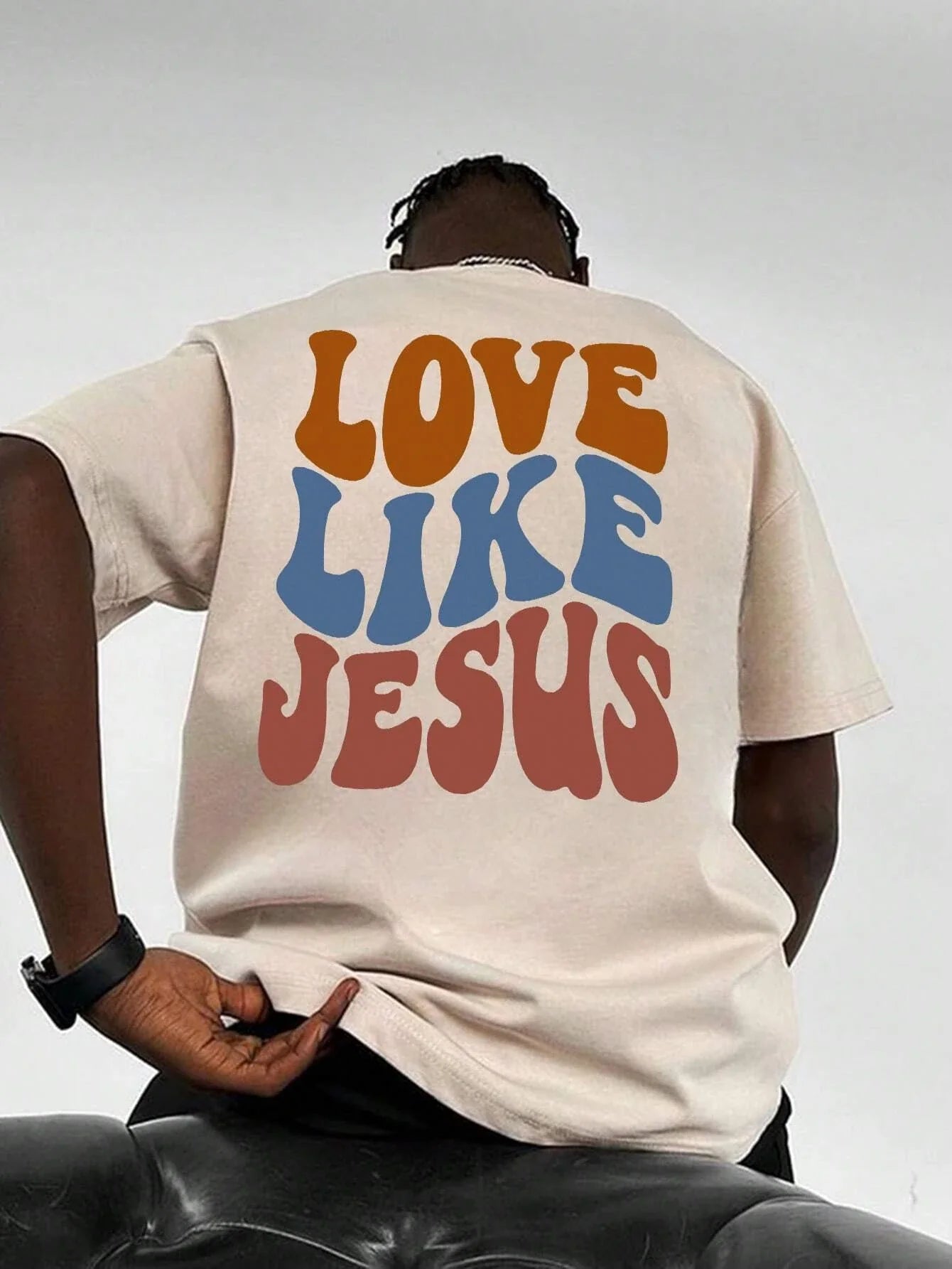 Bold “Love Like Jesus” print — a clear message of kindness and Christian values