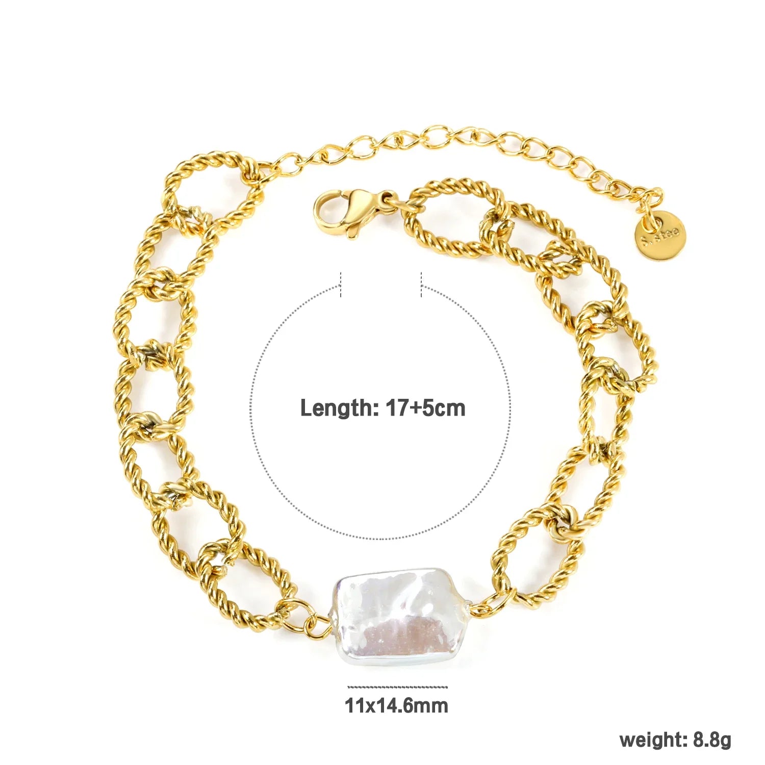 This bracelet is very cute, it has a charm with small pearl beads in the shape of a flower, made of stainless steel in gold color, recommended.