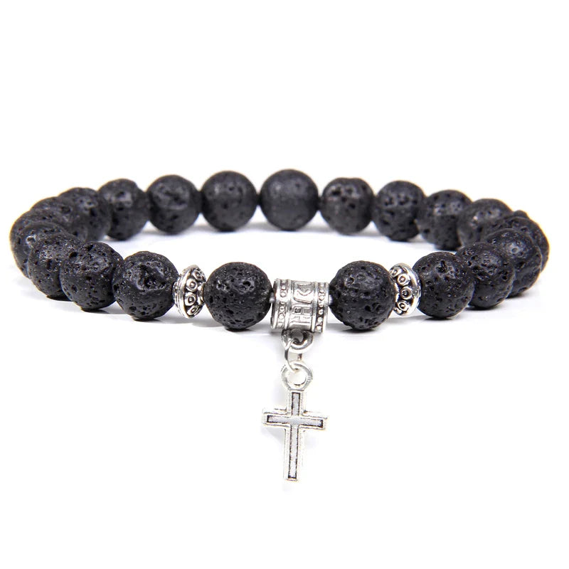 ✨ Trendy Men’s Beads Bracelet with Silver Color Cross Pendant – Natural Stone Healing Jewelry for Women & Men 🌿✝️