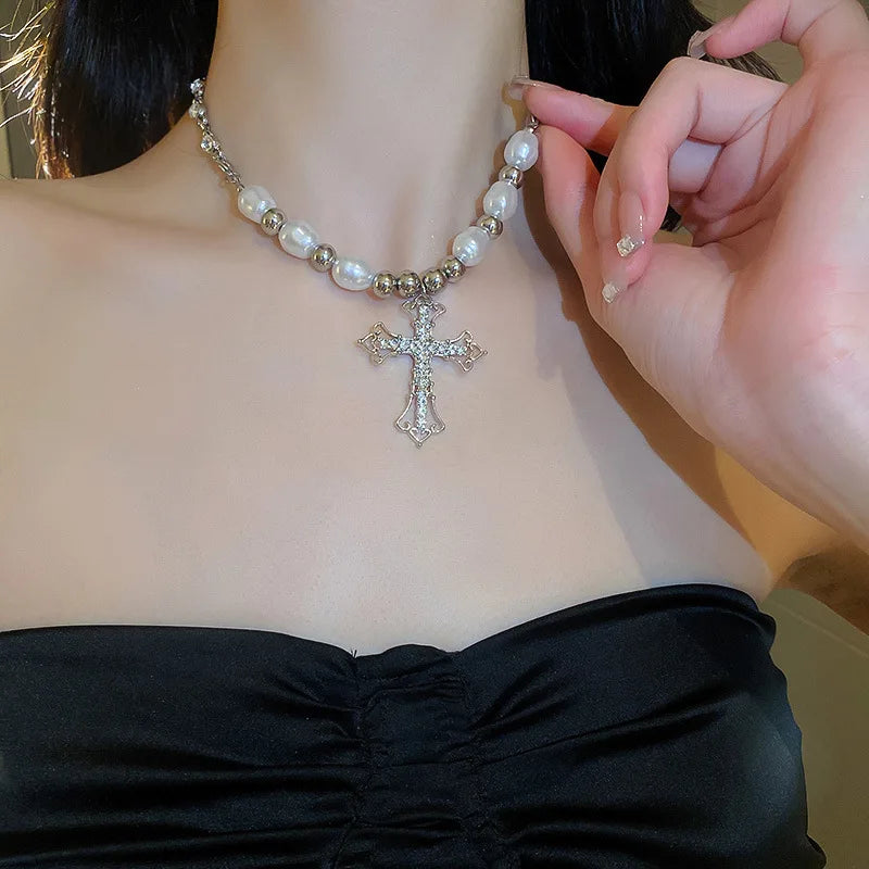 ๐ Eye-catching cross pendant adorned with pearl accents for a luxe retro vibe