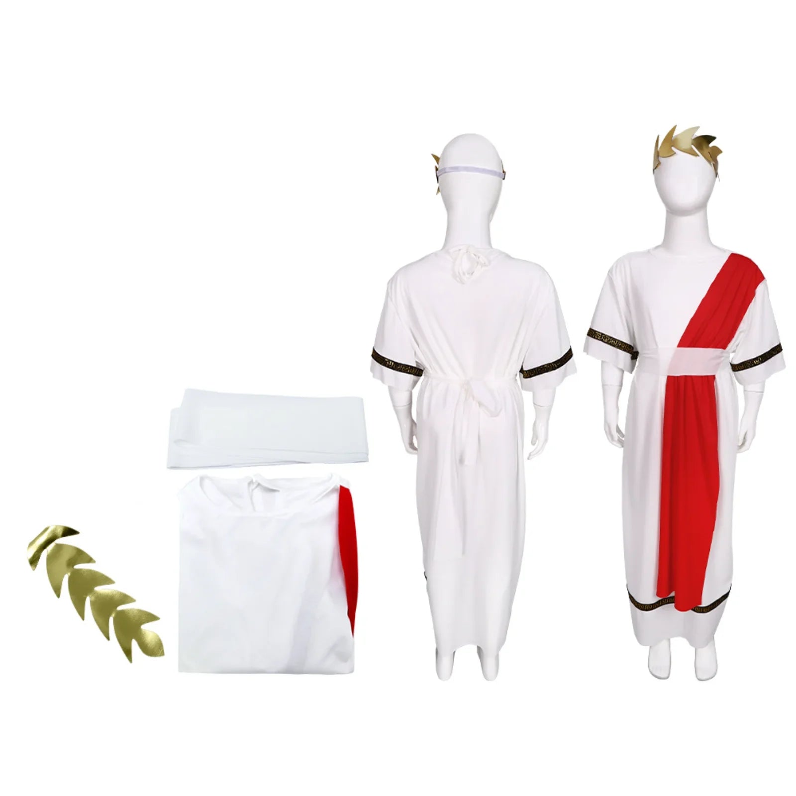 Includes tunic, robe/toga, and accessories like a sash or belt (varies by design)