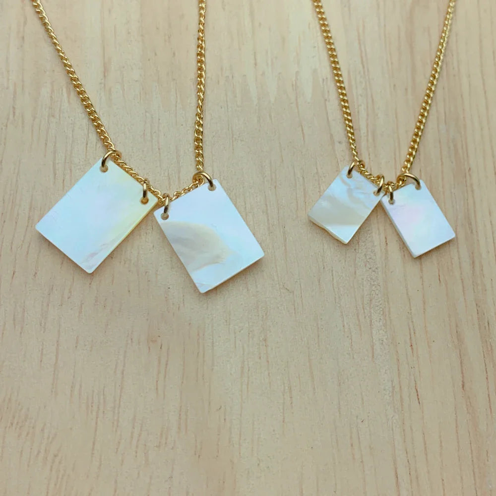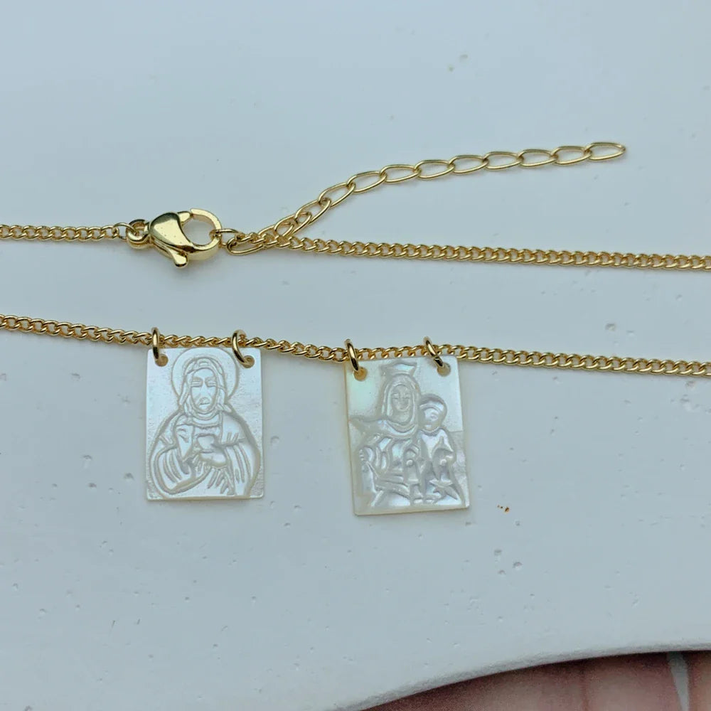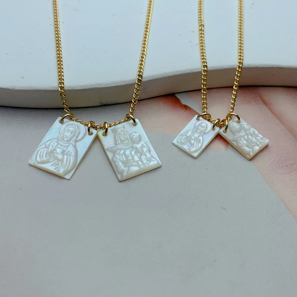 Embrace your faith with elegance through this Jesus & Virgin Mary Necklace, featuring dual scapular-style pendants crafted with Mother of Pearl shell inlays. A meaningful and stylish gift for Christian women of devotion.