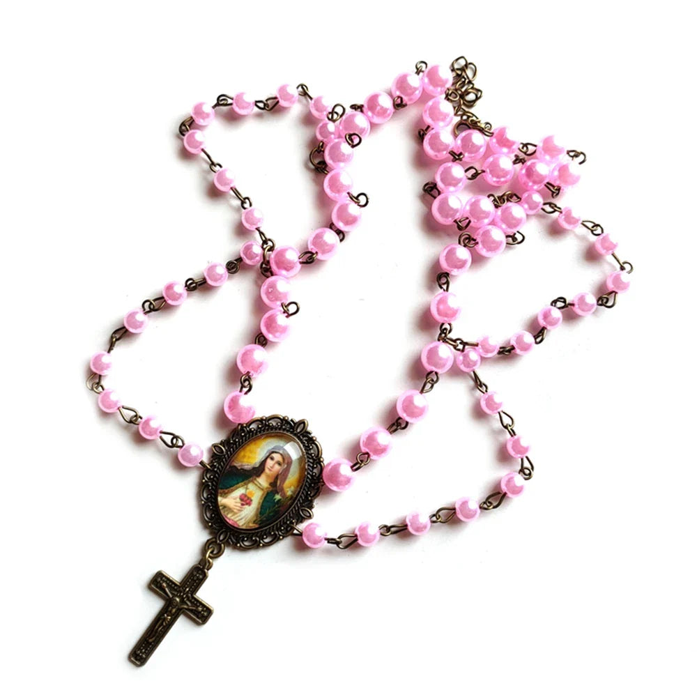 High-quality black acrylic pearl beads, alloy Virgin Mary medallion, and cross tassel charm.