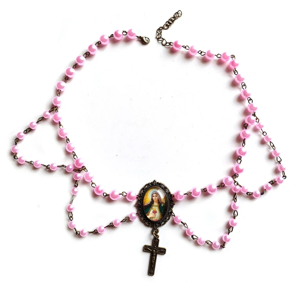 Features a Virgin Mary centerpiece and cross tassel pendant