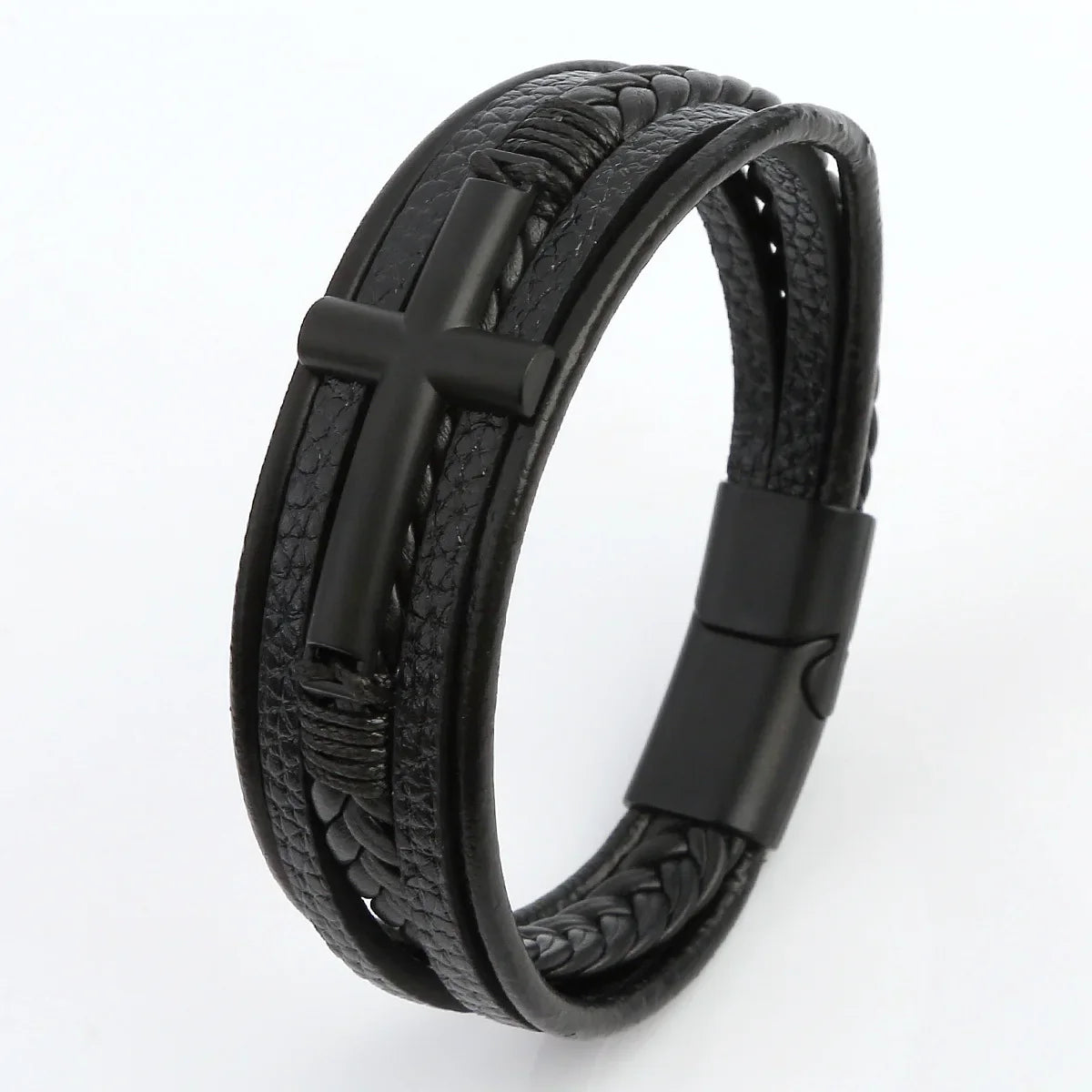 Black Cross Decorative Punk Leather Bracelet – Multilayer Braided Magnetic Clasp for Men