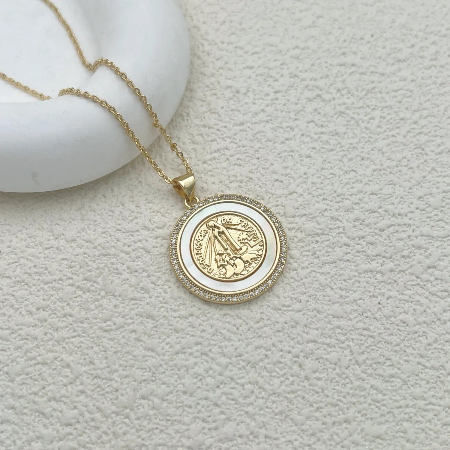 Catholic Jesus Cross Necklace – Gold Plated Copper with Saint Benedict, Virgin Mary & Zircon Details