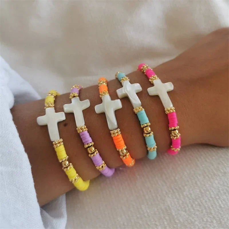 Express your faith with color and creativity through the CCGOOD Christian Cross Bracelet. Featuring soft, boho-style polymer clay beads and a central cross charm, this stretch bracelet blends spiritual meaning with fun, modern design.