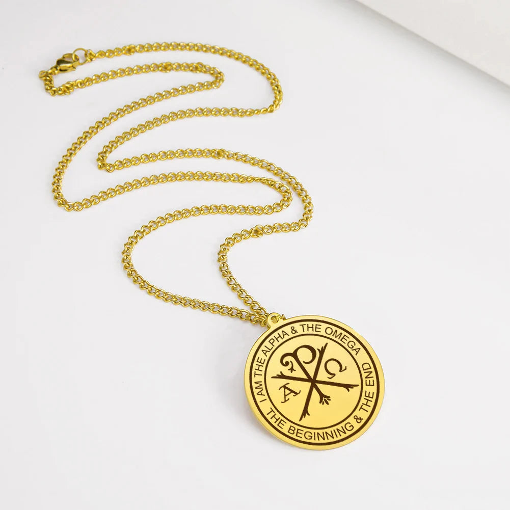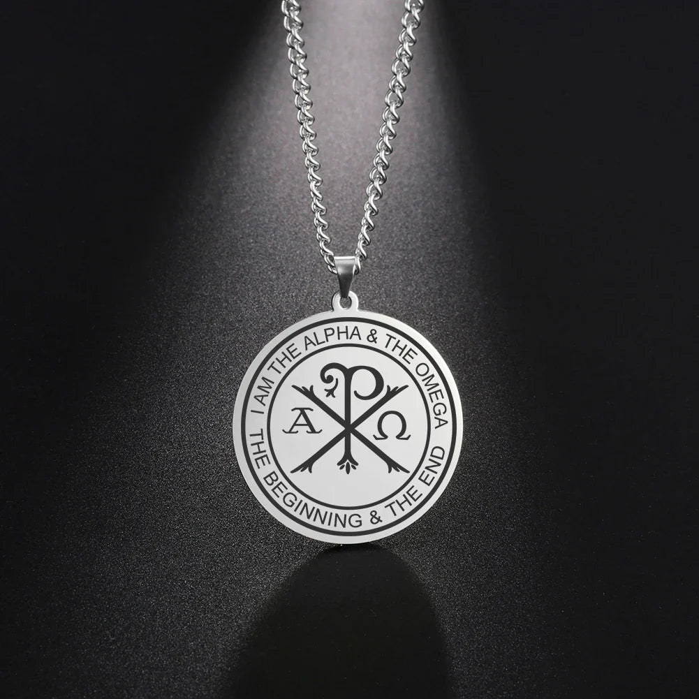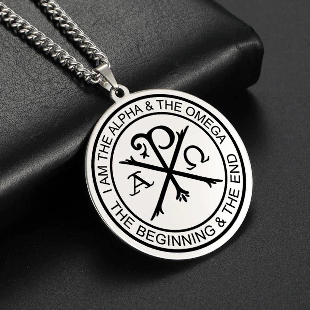 The Chi Rho pendant is a finely crafted stainless steel piece of religious jewelry that radiates sophistication and devotion. Chi Rho is the monogram representing "Christ". Alpha and Omega represent the symbol for the beginning and the end.