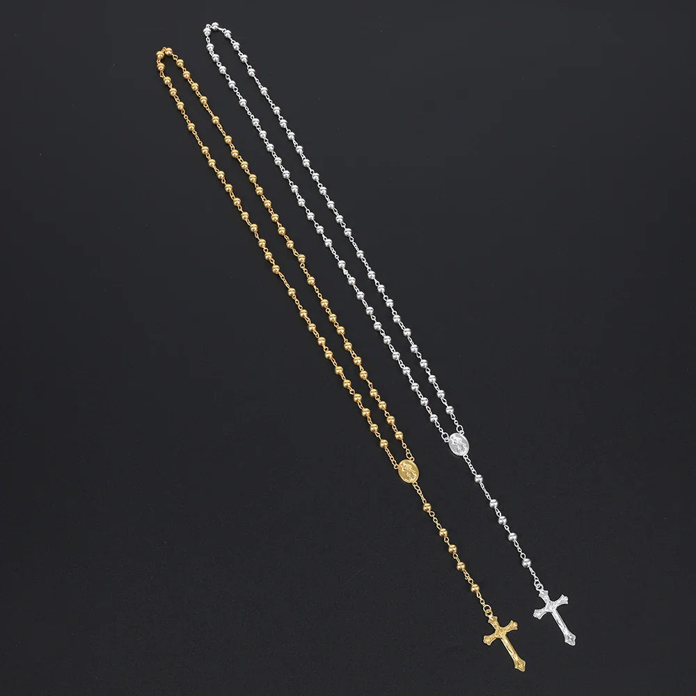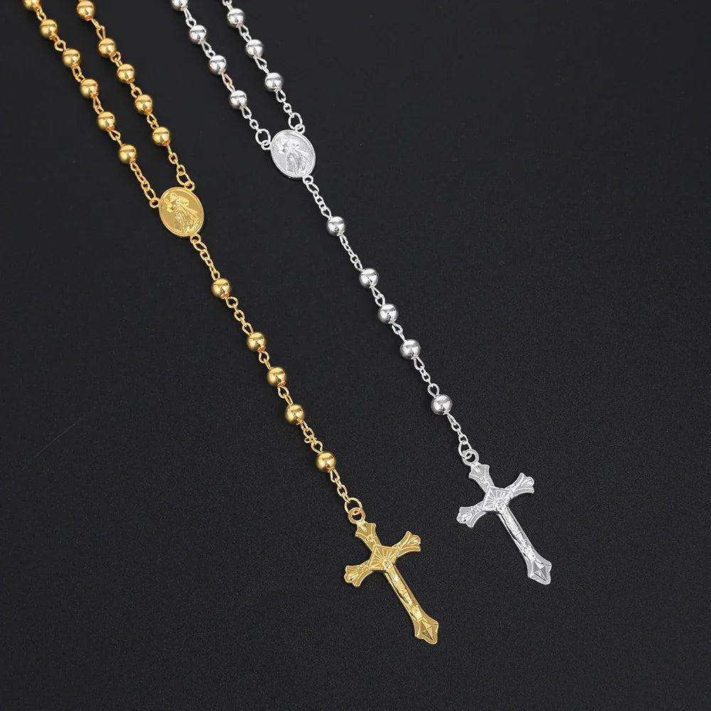 Gold Color Rosary Necklace – Long Crucifix Chain with 6MM Beads for Men & Women