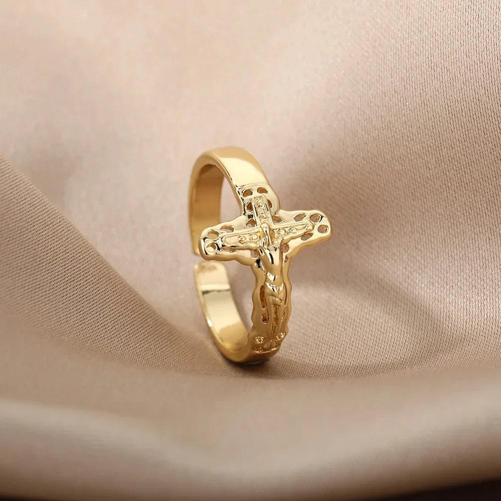 Show your faith with timeless style wearing this Vintage Jesus Cross Ring — a gold color stainless steel adjustable ring designed for both women and men, perfect for religious events and everyday elegance.